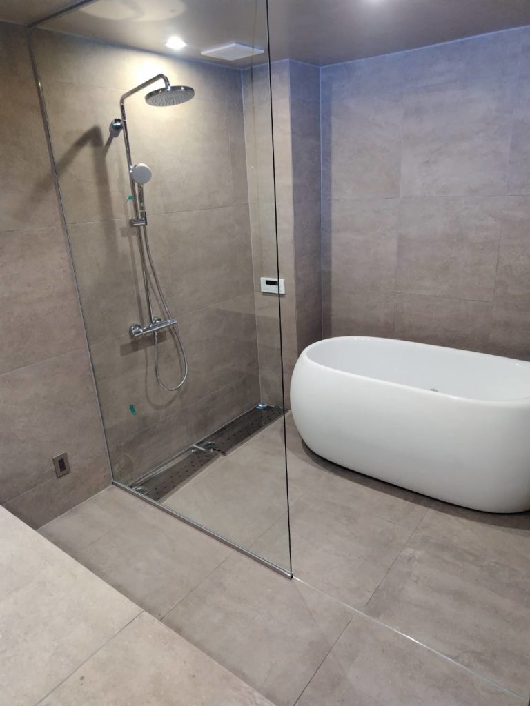コロンとした形が可愛い浴槽に、海外映画に出てくるようなデザインの素敵なシャワーがマッチしています。天井は、ダウンライトでスッキリとした印象に。