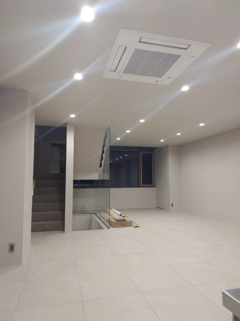 ダウンライトでしっかり明るさを取りつつ、スッキリと。エアコンも天井に埋め込んであるタイプなので、更に広々とした開放感を感じられます。