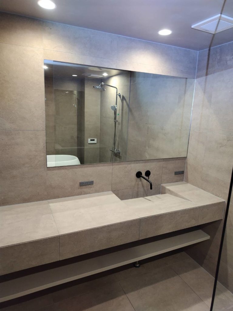 直線的な鏡と洗面スペースに、ブラックの丸い蛇口がアクセントになりますね。